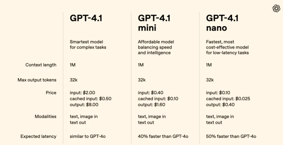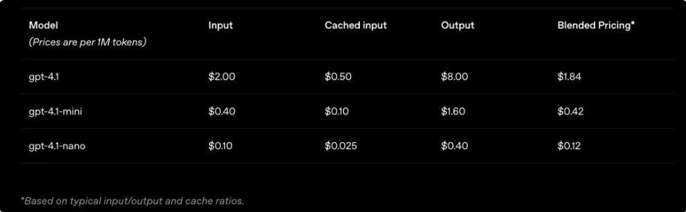 价格方面,GPT-4.1系列在性能提升的同时,价格更具竞争力。GPT-4.1相比GPT-4o价格降低26%,而GPT-4.1Nano作为最小、最快且最便宜的模型,每百万token的成本仅为12美分。