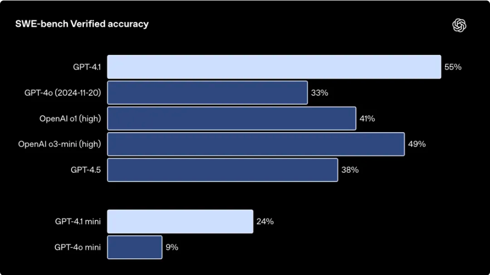 测试结果显示,GPT-4.1在处理长达128Ktokens的数据时显著优于GPT-4o,并且在长达100万tokens的上下文中依然能够保持较高的性能。在编码能力测试中,SWEBench评估将模型置于Python代码库环境,让其探索代码库、编写代码和测试用例。结果显示,GPT-4.1的准确率达到55%,而GPT-4o仅为33%。