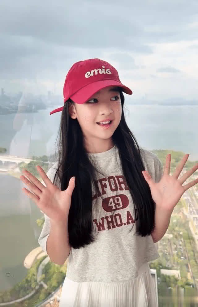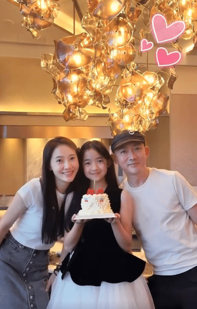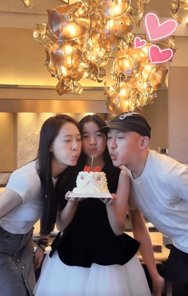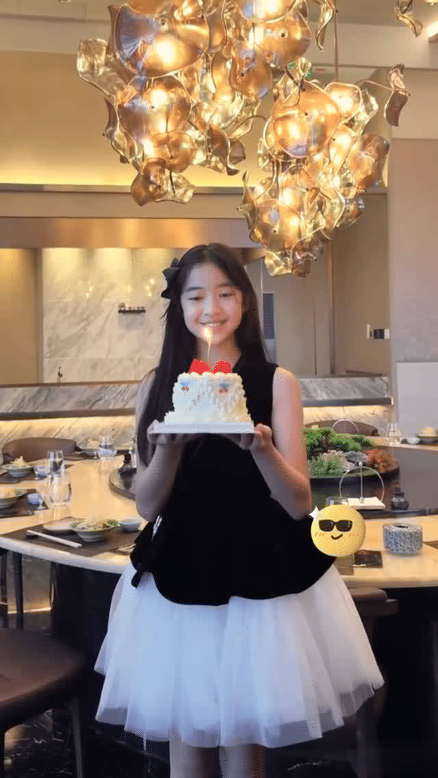 再看天天,身为寿星的她换上一袭黑白连衣裙,披散着一头丝绸般黑色长发,手捧漂亮的草莓蛋糕和爸爸妈妈一起吹蜡烛,好温馨有爱的画面。