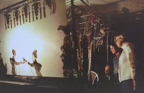 外国友人在七宝皮影艺术馆的皮影戏后台一探究竟。图片来源:@“上海非遗”微信公众号